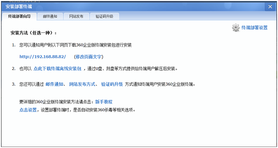 1. 终端访问http://控制中心所在机器的IP地址:80,就能安装360企业版终端了。也可以在登录界面复制终端部署地址,发给终端用户进行安装: