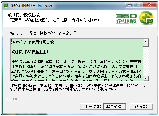 1. 点此下载360企业版(新版本)控制中心,双击控制中心安装程序,进入360企业版控制中心安装向导,单击【下一步】按钮进行安装: