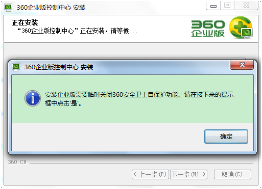 3. 如果当前机器已安装卫士,会弹出需要临时关闭自我保护提醒,单击【确定】继续;