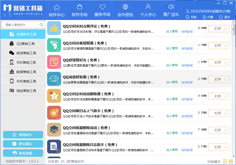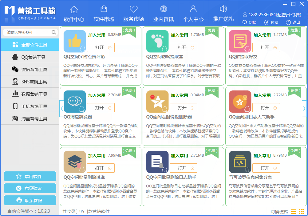 箱是一款营销软件合集,里面包含很多的营销工具,有QQ营销工具,微信营销工具,淘宝营销工具,SNS营销工具等等一系列工具,能够满足用户的营销需求。