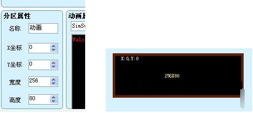 模拟显示区域中,区域的左上角定义为起点坐标。起点x、起点y分别表示当前显示区域偏移起点的横向、纵向长度。单位象素点。高度、宽度表示显示区域的有效高度、宽度。单位象素点;用鼠标选中模拟显示区域中的动画区域然后拉大;或者在动画属性中键入起点坐标,高度和宽度,如下图