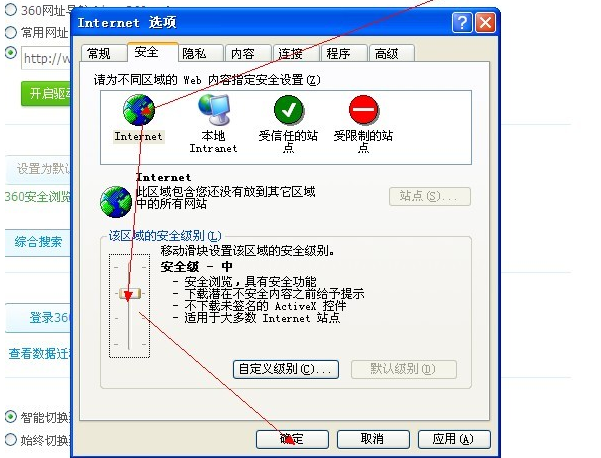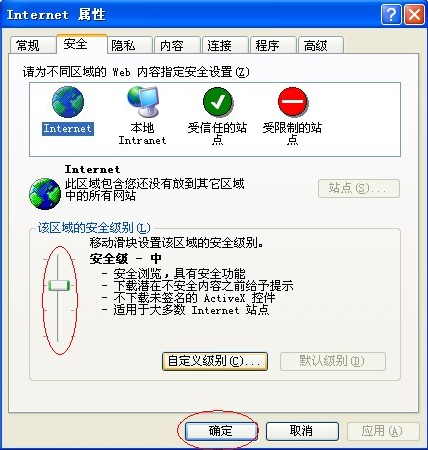 选择工具菜单下的internet选项,在出现的第二张图的界面中点击安全选项卡,选择internet后将该区域的安全级别修改为中级或者中级以下,最后确定!