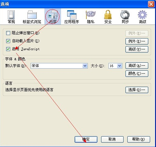 选择工具菜单下的选项,在出现的第二张图的界面中点击内容选项卡,选中启用JavaScript,最后确定!