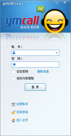 YMCall网络电话可自动存储账号和密码,进行自动登录,如需取消,点击勾选项即可。 2011V4.83新赠功能:A,快速提示密码错误、账号错误、网络错误用。 B,用户自助语音测试热线。