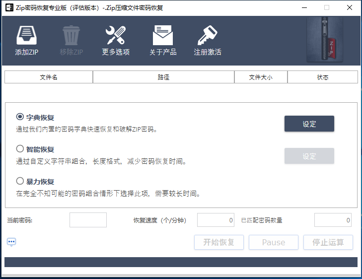 这是一款帮助用户破解zip文件的密码的软件,在没有密码或者忘记密码的情况下非常好用,软件有3种方式破解密码供用户选择,当然对应的方式耗时长短不一!