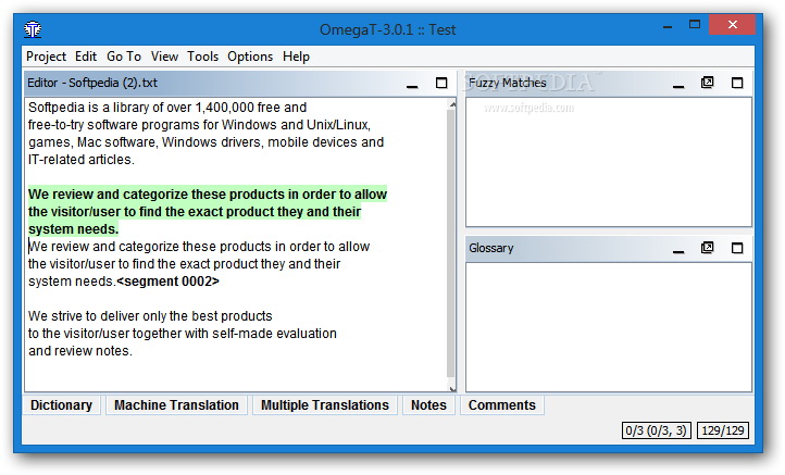 OmegaT可以从Apertium、Belazar以及Google翻译获取机器翻译并显示在单独的窗口中。