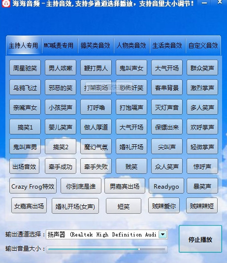一款专门为主播、主持、唱歌打造的。有了它,用户可以自定义音效,有搞笑声、群众笑声、打呼噜等多种音效。让你的平时生活变得丰富多彩,还支持快捷键,可以自定义音效哦!