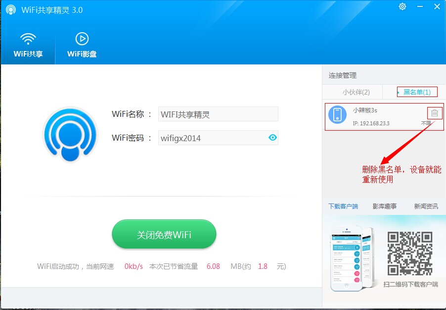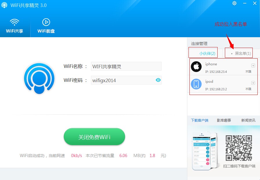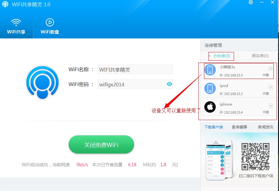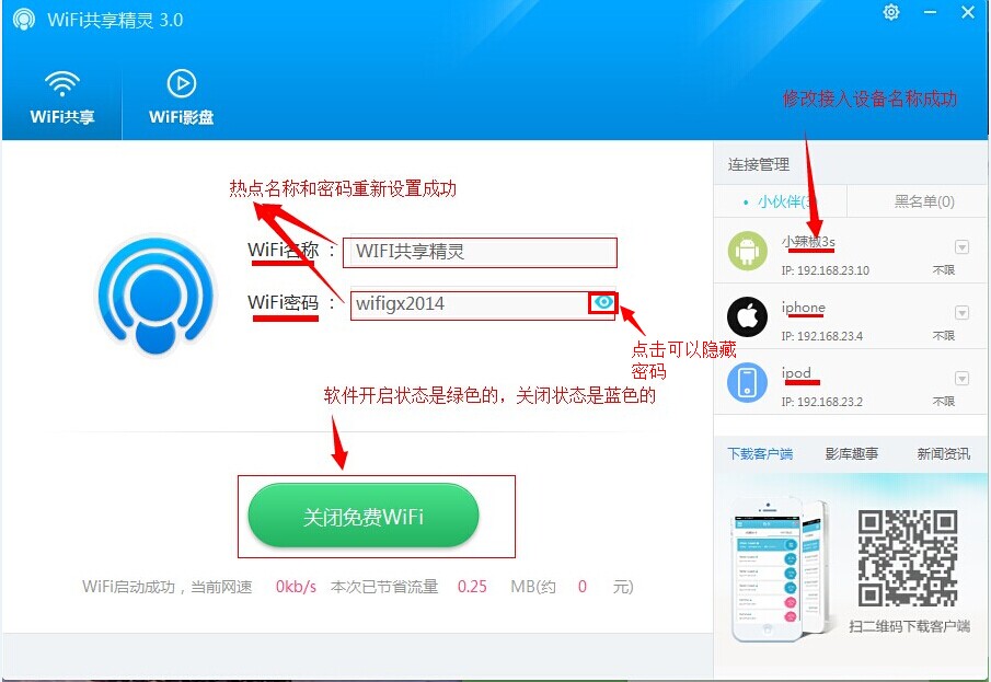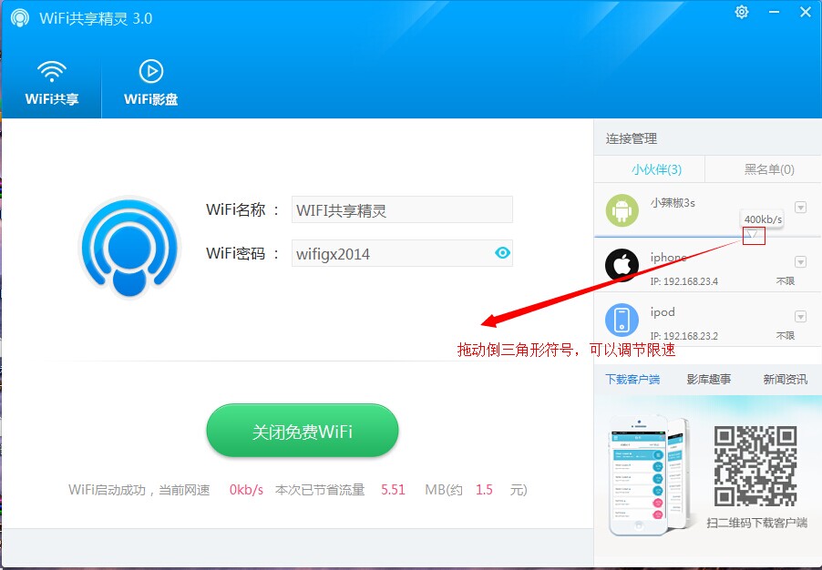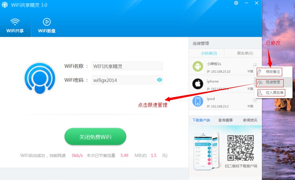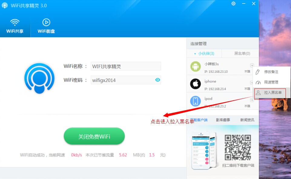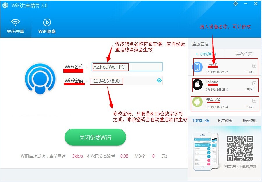 无广告版是由为用户们免费提供的一款WiFi共享精灵绿色无广告版本,在本版使用过程中,用户可以体验真正绿色无广告WiFi上网体验,可以保证每一位用户的安全放心使用;WiFi共享精灵,目前最好用的一款电脑WiFi共享软件,真正免费一键共享上网,让你的手机、iPad、笔记本可以随时随地免费WiFi上网!