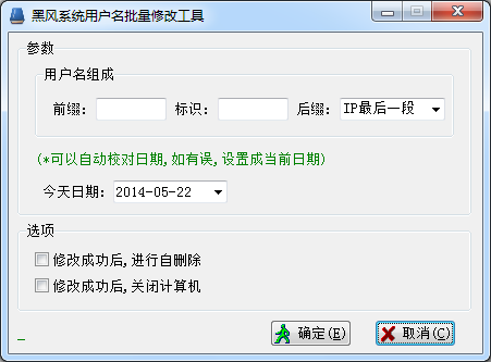 黑风系统用户批量修改工具适合网吧、学校机房等公共电脑用地使用,在批量修改电脑用户名时,可以自定义用户名前缀和标识,后缀则为电脑当前IP。