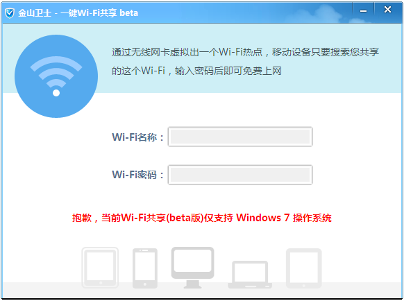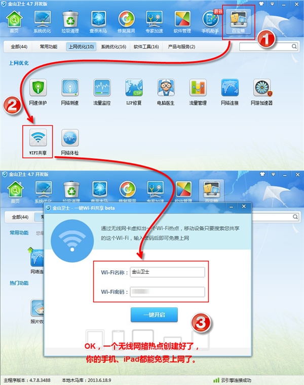 WiFi一键共享是金山卫士4.7版本百宝箱中的新增功能,用户只需要有一台电脑就可以创建WiFi热点,使智能手机、平板电脑等设备免费无线上网,支持所有的无线设备。