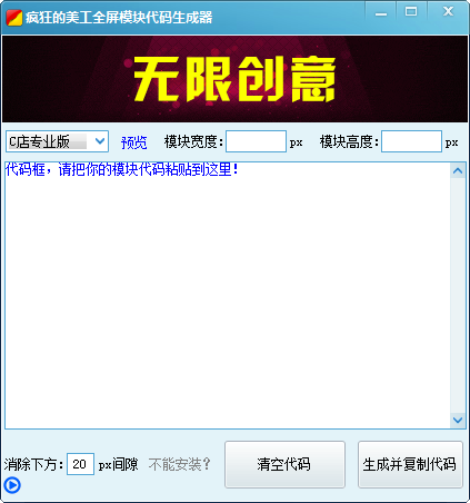 疯狂的美工装修助手是一款强大的多功能淘宝天猫装修辅助工具。目前包含功能:全屏模块生成、全屏轮播生成、客服模块生成、悬浮模块生成、在线客服模块生成、二维码生成、悬浮模块生成 店铺背景代码生成、店铺背景获取、图片变身效果模块生成、天猫品牌店铺关注按钮生成器后期将会添加更多高级功能,授权用户可以免费使用。