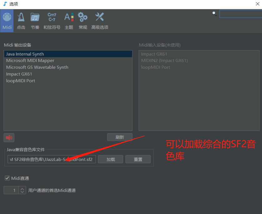 关于音色库,支持的三方格式的音色库,在选项里面进行选择加载。