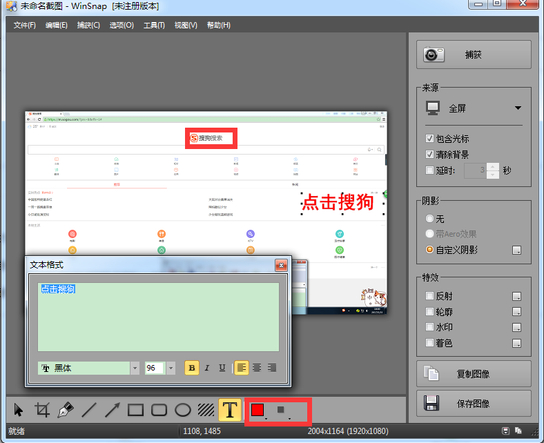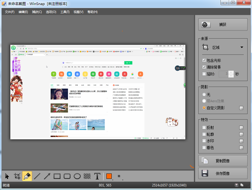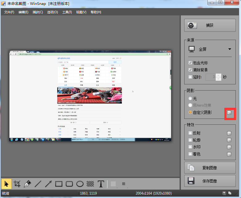 WinSnap是一个轻巧、快速、、友好的截图工具,提供屏幕截图和图像编辑功能。和其它相比其最大亮点在于WinSnap可以捕获或去除Win7的 Aero玻璃效果。WinSnap内置了阴影,反射,旋转,水印等效果,支持各种图像格式,并支持自动保存。