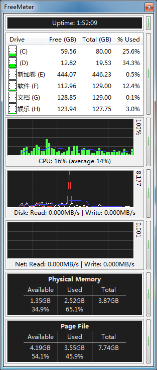 好用的系统监测工具,可检测磁盘、CPU、内存的使用情况、网络流量、磁盘传输速率。Freemeter全面支持UNC,所以可以检测网络磁盘。它不需要安装,只要您将原始的压缩文件给解开之后直接执行“Freemeter.exe”这个文件之后,便可以为您做好最佳的系统监控。