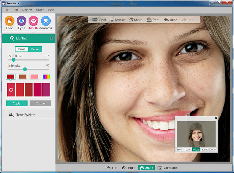 Beautune针对面,眼,嘴设计了3个独立的美化频道,再加上多样化的照片辅助修改功能,无敌了!妹子们,直接将你的玉照拖入Beautune即可开始编辑。