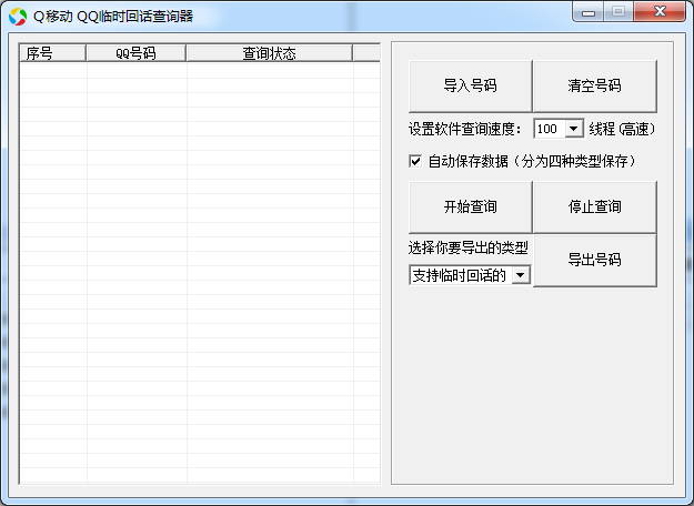 QQ临时会话查询器是一款绿色小巧且使用简便的QQ临时会话查询软件,这款软件可以帮助你批量快速查询QQ是否支持临时会话,然后它会自动根据不同的查询结果进行保存,qq临时会话查询器功能强大,无需登录小号、无需更换IP、无限制查询、批量筛选精准数据!软件采用多线程技术,查询速度每小时能够达到几十万以上,非常给力!