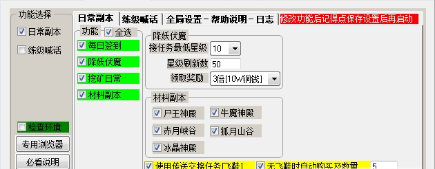 2、登录游戏 并根据自己的需求,设置脚本界面,设置完成后点击保存设置按钮