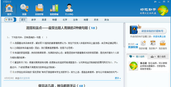 好题助手以精选好题为核心内容的在线教辅工具。充分融合了学生和老师的共同需求,是最专业,最实用的助教、助学、助考工具。 从学生学习思维、老师教学和考试出题方式、学习训练,以及教学内容、教学方法等不同的角度深入研究,把和互联网最佳结合, 成为教学者和学习者的必备工具,成为中国最具实力的教研、学习自助平台,为帮助更多学生突破,改变人生。