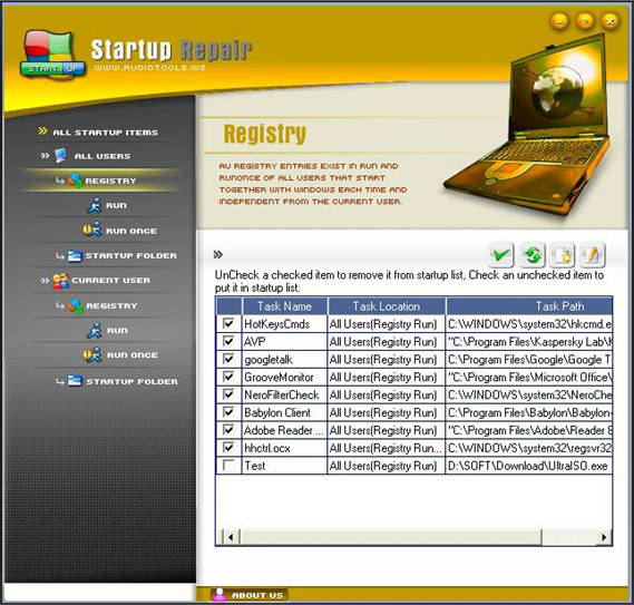 3、自动起动项分析:分析注册表、自起动文件夹、服务、驱动、计划任务等所有自起动项,对可疑的自动起动项进行高亮显示,并对其可进行清除。