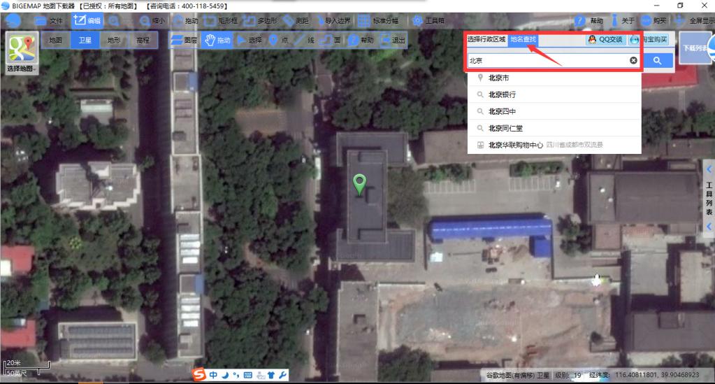 软件右上角【地名查找】,输入你要查看的地方,如下图:
