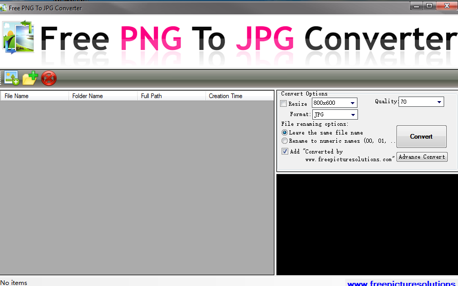 多PNG to JPG Converter是免费的图片解决方案带给你另一种图像格式转换器应用程序。正如名字一样,它与PNG扩展为JPG最流行的图像格式转换您的图像。 JPG广泛应用于几乎任何数码相机等数字成像装置以及在计算机的应用程序。几乎所有的标准成像应用程序支持JPG扩展。