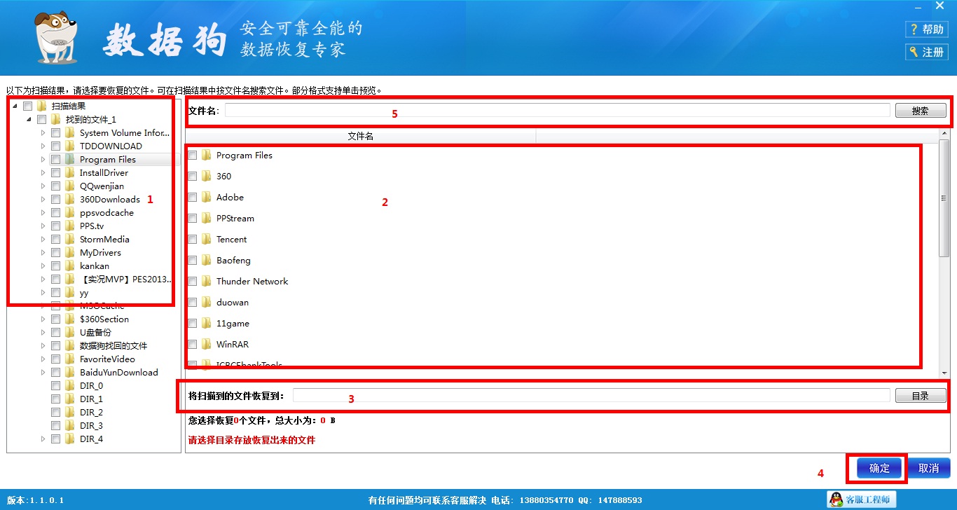 第四步:待扫描完成后,软件自动进入“恢复文件选择界面”,如下图所示。如果您想要恢复移动硬盘里的所有资料,那么请在区域1内的菜单栏中选中所有文件夹;如果您只需要恢复移动硬盘里的部分资料,您可以在区域1内选中您需要恢复的文件原存放的文件夹,然后再区域2内找到并选中您需要恢复的文件,您也可以尝试使用区域5内的搜索功能,直接将您需要的文件显示在区域2内。找到您需要的文件后,单击文件名还可以对文件进行预览。接着,在区域3内选择文件恢复后的保存路径,为保证恢复成功,请勿将恢复数据的保存位置设置为您格式化的移动硬盘。完成上述步骤后点击区域5内的确定。