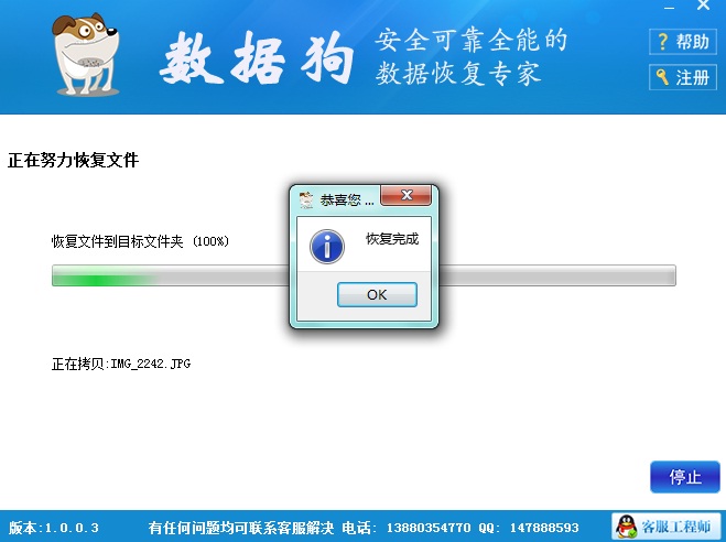 第五步:等待数据恢复完成,完成后点击OK按钮,如下图所示。