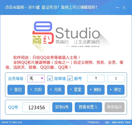 易简约QQ名片是2015年最新的一款QQ装逼神器,这款软件可以由用户自定义QQ号码、会员等级、QQ等级、Q钻等级、活跃天数等,这些都可以用来装x,易简约QQ名片装逼神器,支持修改会员等级,靓字,活跃天数,赶紧来下载这款软件发到朋友圈里晒一晒吧。