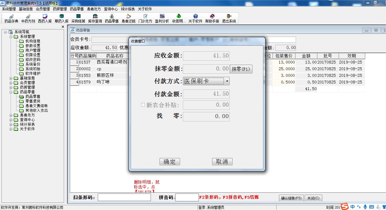 君科诊所管理软件的收费发药功能模块能够自动打印多种式样收据、自动累计、找零。支持多种收费方式,收费项目自定义设置,此外软件拥有收费欠帐功能,对欠帐进行统计,及时了解您的经营状况,使您的管理更轻松、快捷、高效,支持新农合支付。