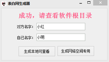 表白网生成器软件是一款表白的辅助实用工具,当你把你的名字和对方名字写在框框里,点击生成,在目录就会生成一个html的文件,点击就可以进入网页看见表白的话语,是不是很浪漫,喜欢的赶紧下载使用。