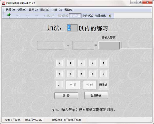 2、单击“开始”按钮再单击“出题”按钮,程序自动出题。在编辑区内输入答案,用鼠标单击“判断”按钮就可判断对错。程序会给出提示(答错时有正确答案提示)。