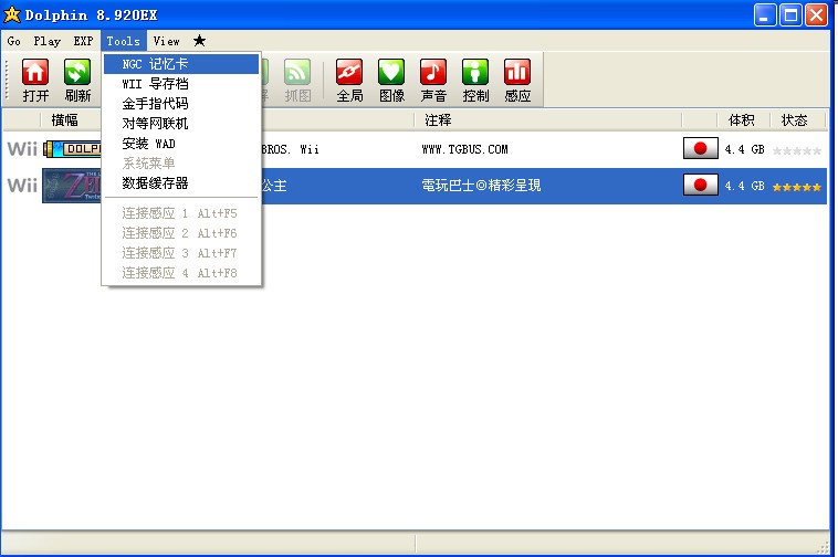 ⑨ 在Tools菜单可以管理NGC记忆卡和导入Wii主机存档等