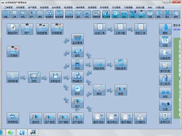 3、电脑配件管理:配件调拔、配件报废、配件添加、配件取出,软件管理、机房巡检、交班日志、设备租用、日程提醒等众多模块。