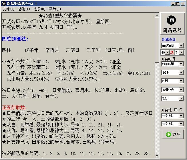 此款软件分析开奖时间的八字、卦象,使用深奥的易学理数,并应用到彩票选号中。