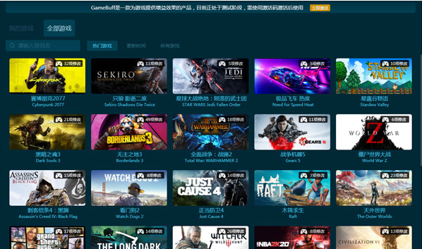 Game Buff是一款非常好用的整合工具,能够为用户提供、GTA5、看门狗、荒野大镖客等之类的上千款热门游戏修改器,能够自动匹配本地游戏,能够为你的游戏带来的更完美的体验,感兴趣的玩家欢迎下载使用!