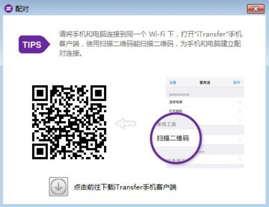 请将手机和电脑连接到同一个W-Fi下,打开 “iTransfer”手机客户端,使用扫描二维码能扫描二维码,为手机和电脑建立配对连接。