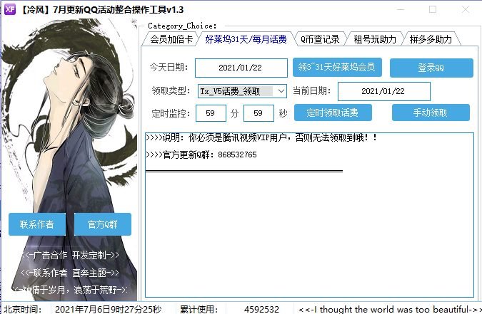 冷风7月更新QQ活动整合操作工具是一款针对QQ的辅助工具,通过这款工具可以帮助用户一键领取QQ活动奖励,当然,前提是你必须是超级会员SVIP6级以上,不然没办法进行领取,有需要的朋友快来下载吧。