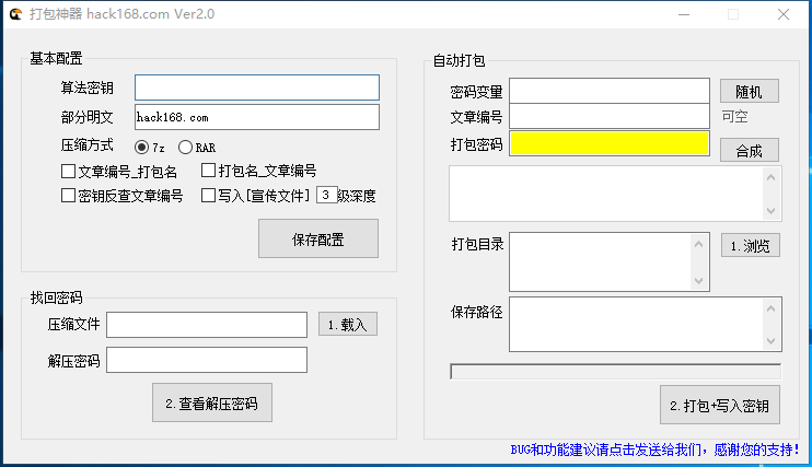 打包神器,是一款用于给文件打包的工具,可以在基本配置中设置密钥、铭文、格式以及一些编号等信息,这样打包时就能轻松写入秘钥,帮助用户压缩成经过加密文件包。