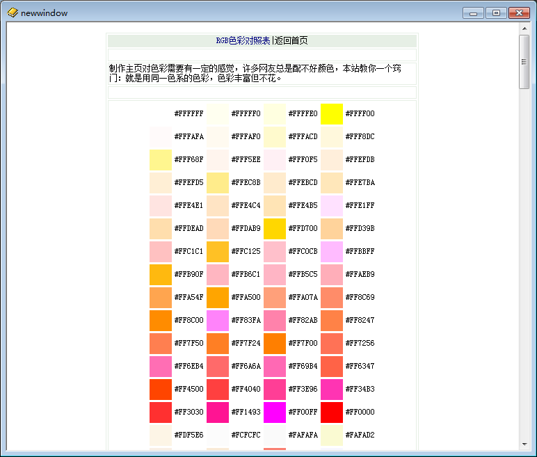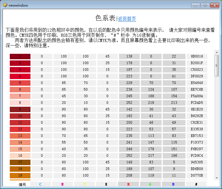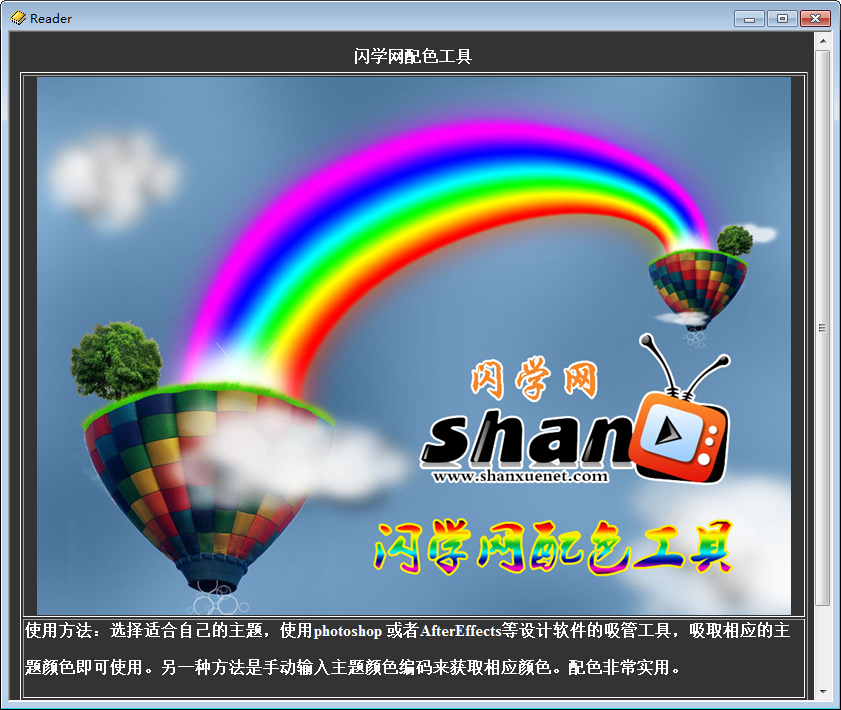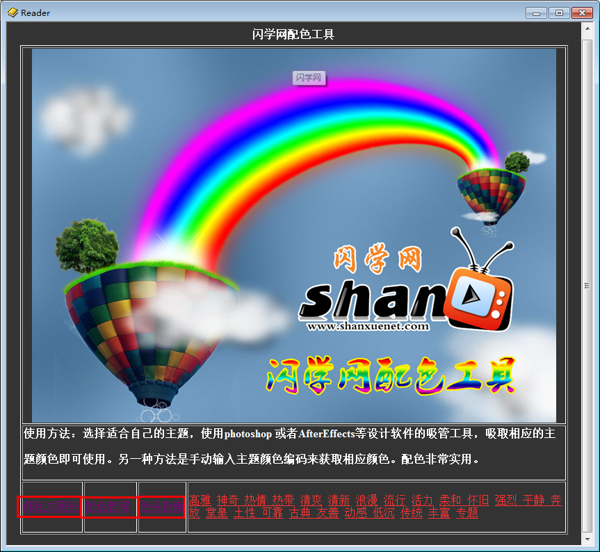 闪学网配色工具内置颜色对照表、色系指南以及配色教程(在主界面的左下方位置分别有三个按钮)