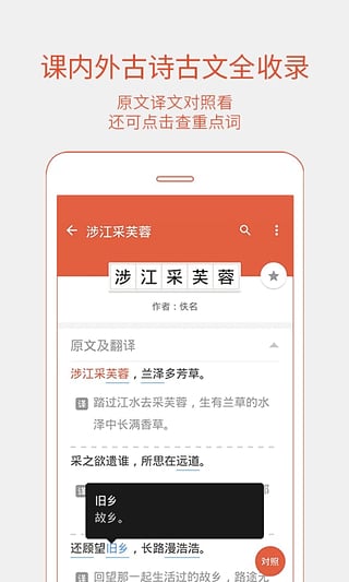 课内外古诗文全收录,原文译文对照看,还可以查看重点词!