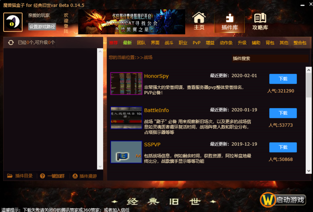 魔兽猫盒子是一款专门针对魔兽怀旧服的辅助工具,它可以帮助广大怀旧服玩家解决各类插件下载更新的问题,所有资源均为100%匹配魔兽简体中文客户端。有需要的朋友不要错过了,欢迎大家下载体验。