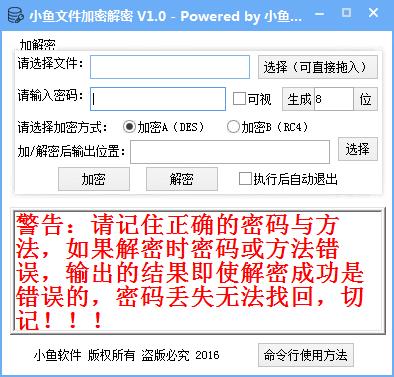 小鱼是一款绿色小巧、安全性高的文件加密软件,通过小鱼,您可以通过DES和RC4两种特殊加密算法加密一些机密文件,可自定义密码,并可直接解密、生成密码!软件小巧绿色版,无需安装,装在U盘里可随身携带或作U盘加密软件使用!并可直接命令行调用,适合各种用途的其他类型软件使用!作者以命担保软件绝无病毒,如遇某些较落后或较严格的软件误报属正常现象。