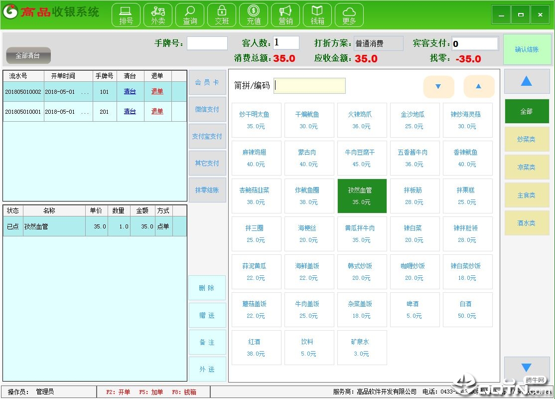 高品收银系统是高品公司出品的专业化餐饮行业收银管理软件,适用于餐厅、超市、生鲜店、理发店、服装店等各行零售行业,本收银系统绿色实用,并且系统界面简洁优美,操作直观。
