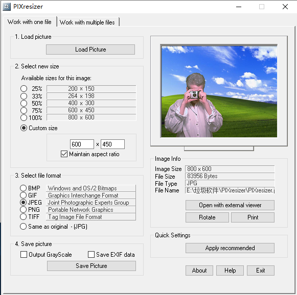 此外,您可以调整DPI级别,将样本图像移动到屏幕的中央或左上角,使其成为横向或纵向,或者只需单击按钮即可应用PIXresizer建议的设置。