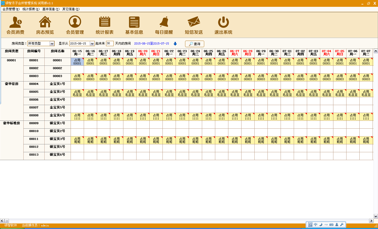 包含会员消费,房态预览,会员管理,统计报表,基本信息,每日提醒等几个主要功能模块。