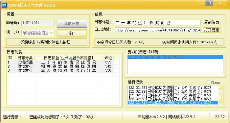 Qzone日志人气大师是一款刷qq空间日志人气也就是浏览量的软件,支持批量刷人气,完全绿色免费,喜欢的可以下载试用!