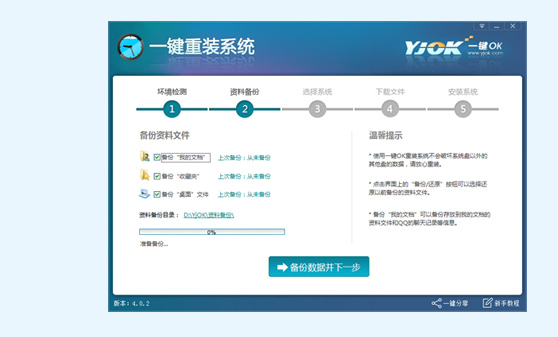 steps 2:可以选择备份“我的文档”、“收藏夹”、“桌面”,选择后点击下一步会自动备份数据(需要跳过备份则不选择),点击“备份数据并下一步”备份资料将保存至您的计算机最大的分区里面。