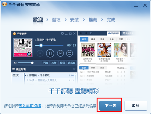 千千静听安装,默认同意协议,直接点“下一步”