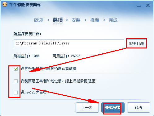 在安装前,可变更安装目录,去掉多余安装项,然后点击“开始安装”
