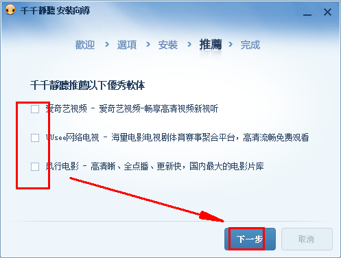 安装完成后,进入推荐界面,取消已勾选的安装软件,进入“下一步”
